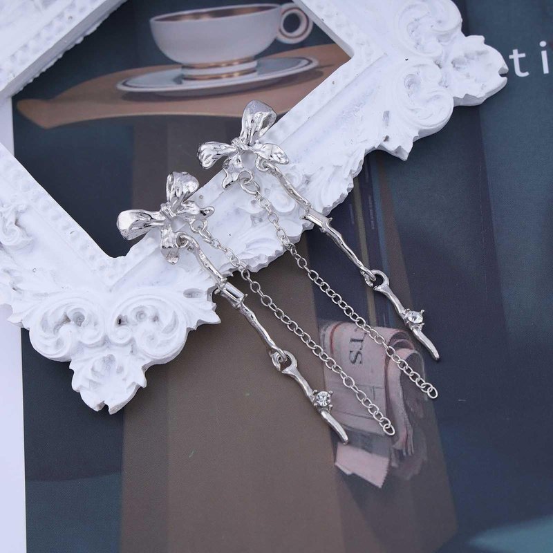 - Rhinestone chain dangle earrings.Item Details:Handmade Item.Size:As Shown.Color:Silver.Materials:Quality Alloy/Bow.Location:Ear.Style:Boho/Vintage.