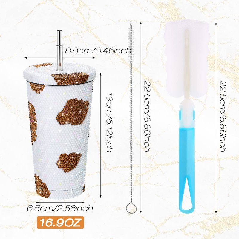 Studded Bling Diamond Tumbler Glitter Water Bottle with Lid Stainless Steel Vacuum Thermal Straw Tumbler Rhinestone Tumbler with 1 Pcs Cup Brush 6 Pcs Straw Brushes for Women (16.9 oz, Cow)