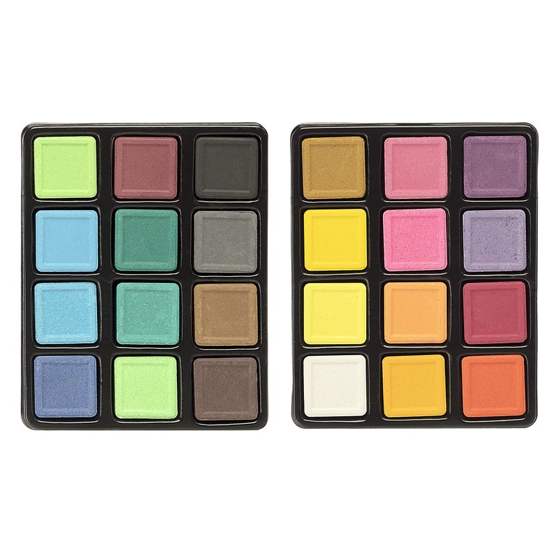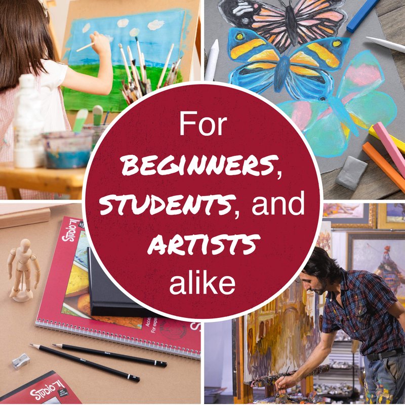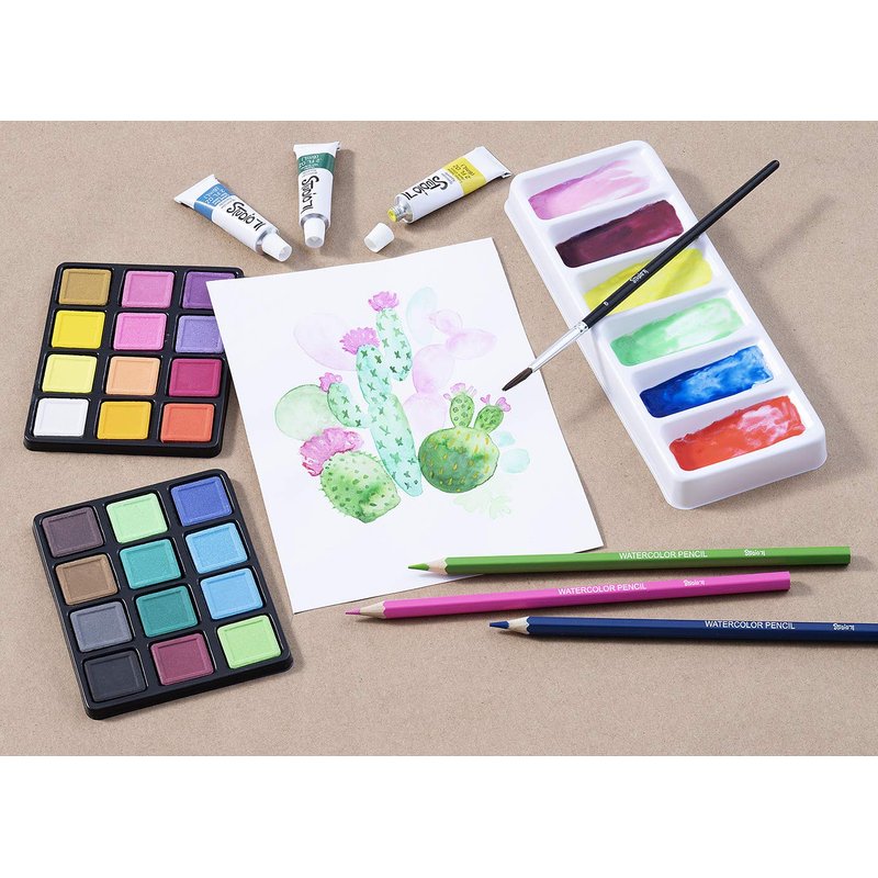 - Includes watercolor cakes and paints, watercolor pencils, paintbrushes, paint palette, eraser and pencil sharpener
