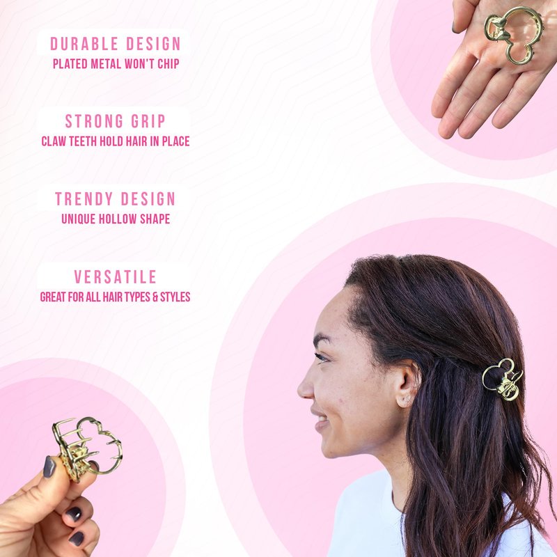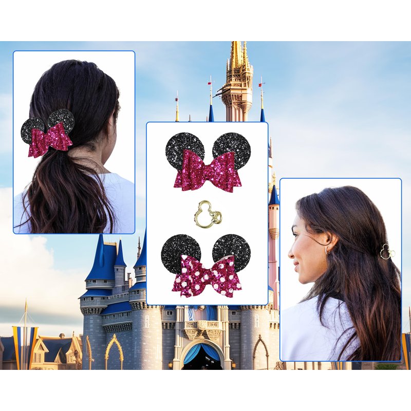 - 3 Piece Black Mickey Ears Set: This mouse ear set includes a pink, black & white sparkle polka dot alligator clip, a solid pink sparkle alligator clip and a gold hollow design claw clip. The iconic minnie mouse hair clips design is a great value and more affordable than purchasing at parks.