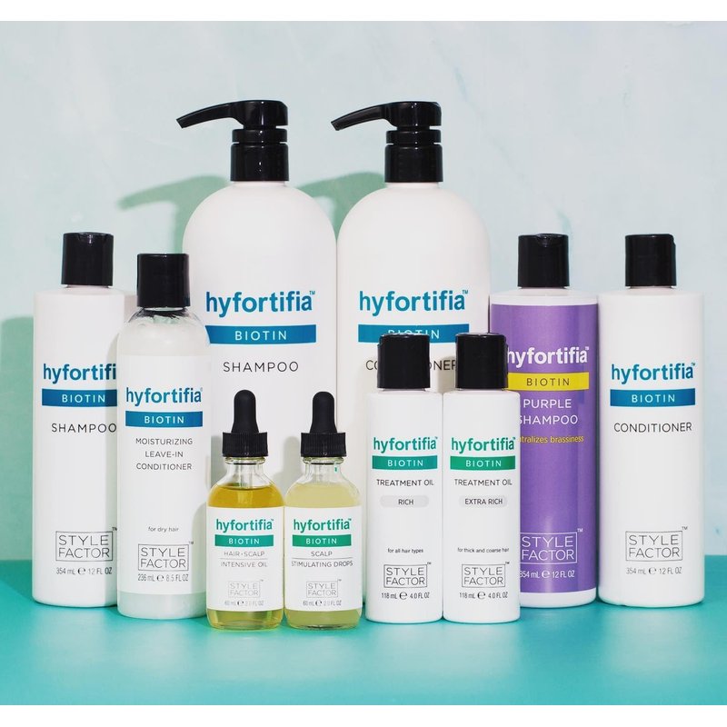 Stronger hair starts with a healthier scalp. Hyfortifia’s line of shampoos, conditioners, and hair oils are specially formulated with nourishing botanical oils and proven natural ingredients. We focus on fortifying hair with instant shine and lasting moisture. In addition to nourishing the scalp, Hyfortifia also shields hair from further damage. Dull hair that is stripped of moisture or suffering breakage needs ongoing protection, not just a one-time revival treatment. Our flagship product line is infused with biotin for thicker strands and touchable softness, but that’s only the beginning. As we continue to grow and launch new products, we’ll always stay true to our purpose – creating clean, healthy haircare that empowers natural beauty. Hyfortifia helps you radiate confidence and get the look you love. BIOTIN SHAMPOO - Cleanse and clarify without stripping your hair. This biotin-infused shampoo locks in moisture for a gentle refresh. BIOTIN PURPLE SHAMPOO - Pull out brassy tones, not moisture. Hyfortifia helps your hair look vibrant and bright with nourishing botanicals. BIOTIN CONDITIONER - Touchably soft and effortlessly smooth. This conditioner takes shine to the next level without weighing you down. BIOTIN TREATMENT OIL RICH - This nourishing oil delivers potent protection to treat breakage and dullness for all hair types. BIOTIN TREATMENT OIL EXTRA RICH - This nourishing oil delivers potent protection to treat breakage and dullness for thick and coarse hair types. BIOTIN SCALP STIMULATING DROPS - These premium botanical oils are blended with biotin, so you can have stronger, longer, and softer hair. BIOTIN HAIR AND SCALP INTENSIVE OIL - Confront existing breakage and protect against future damage. This nourishing oil seals in moisture to shield tresses from end to end.