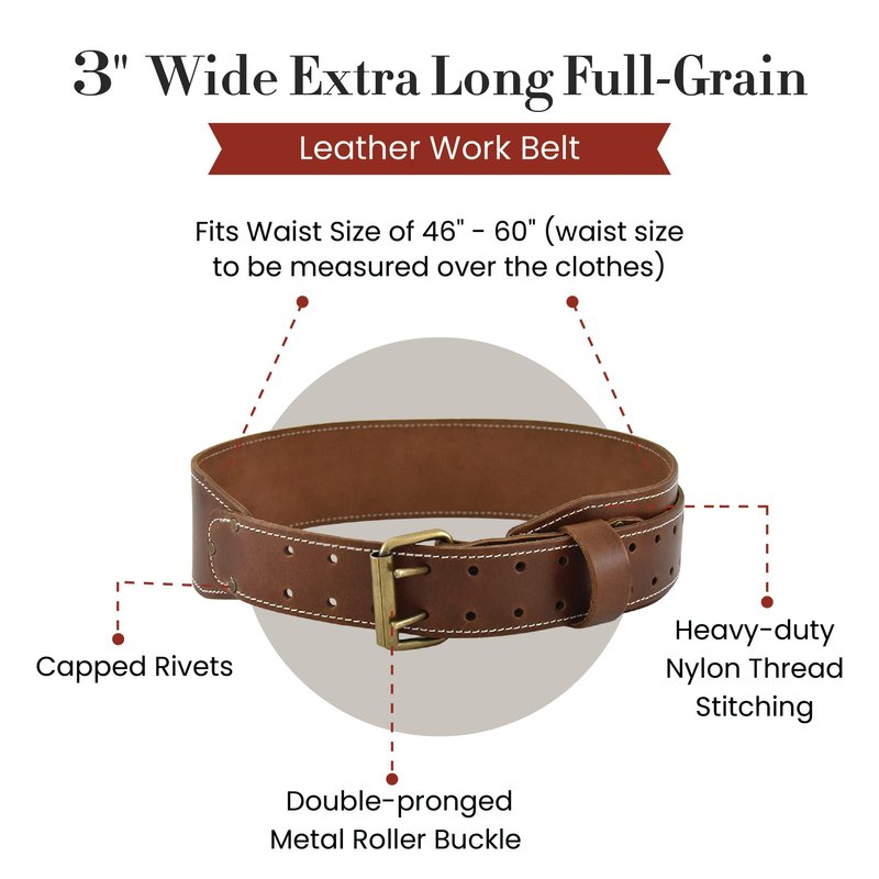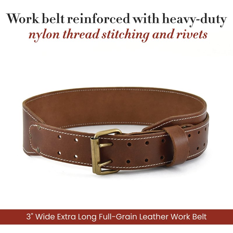 - Sturdy Construction: An ideal belt for all workers who need longer belts, this work belt is 3" wide and has a 3-piece construction with joints reinforced with stitching and rivets for extra strength, longevity, and durability.