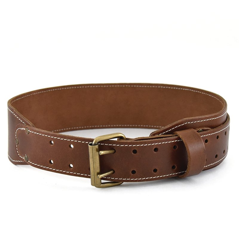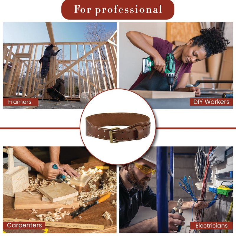 - Stylish Work Belt: Available in dark tan color, this work belt features a heavy-duty double-pronged metal roller buckle and capped rivets for safety. All its metal hardware has an antique finish for a premium appearance.