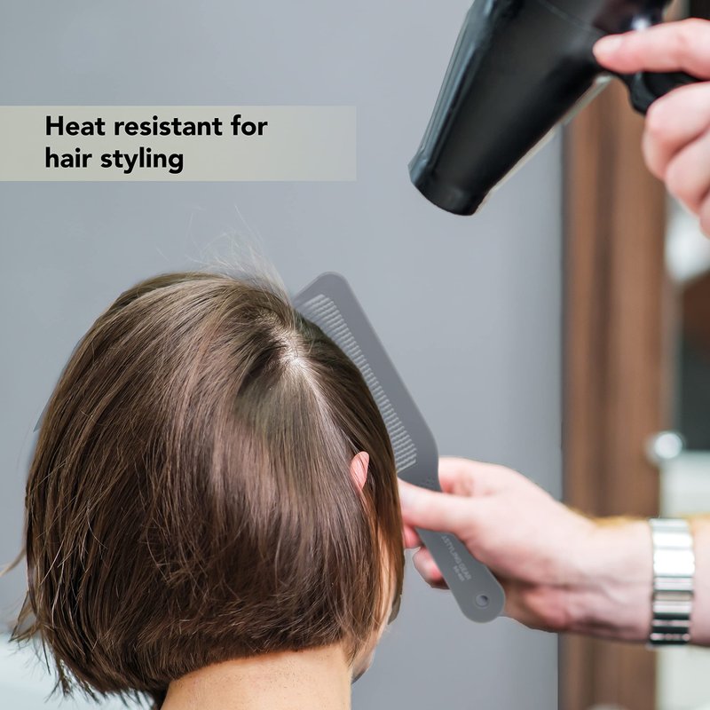 Designed with barbers in mind, our flattop comb has everything you need to detail your client hair with precise results. This fading comb is perfect for any smoothing and blending techniques needed for a clean, sharp look. Built for durability and performance, this versatile comb uses premium materials and rigorous construction to provide you with a comfortable, effective hair grooming experience. Heat-resistant, chemical-resistant, and static-free design. With each comb individually wrapped for hygiene, you'll want to keep this in your hair cutting kit at all times. The perfect balance of versatility, comfort, and function, our durable barber combs for men have rounded edges and a smooth thumb rest so that you won't tire as quickly when styling your client. The wavy teeth of this comb allow for a clean cut and even blending of hair. Unique aspects: Designed for clipper-over-comb techniques. It works great for flattops, buzzcuts, and blending a fade. Great for everyday use at the barbershop or home. Wavy teeth that prevent hair from slipping while hair cutting and combing. The textured handle grip helps you maintain control. Hanging hole for easy storage Product details: Dimensions: 9.5 x 2 x .017 inches. [extra large] Item weight: 1 oz