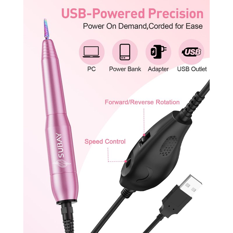 - ERGONOMIC DESIGN AND PORTABLE NAIL DRILL: The electric nail drill features a new pen-shaped handle that is small, lightweight and ergonomically designed for a comfortable grip. Its portable design allows users to practice nails anytime, anywhere. Standard USB port makes it easy to connect any USB device(NOTE: The adapter is not included)