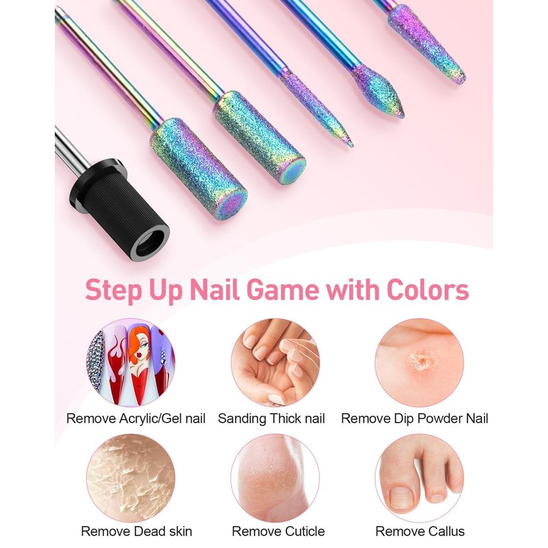 - NAIL DRILL KIT FOR ACRYLIC GEL NAILS: The acrylic nail drill kit comes with 6 iridescent nail drill bits and 26 sanding bands.It meets all your requirements for buffing, polishing, sharpening, grinding, sanding and buffing acrylic and gel nails, as well as trimming thick natural toenails, removing extension gels, cuticles and dead skin
