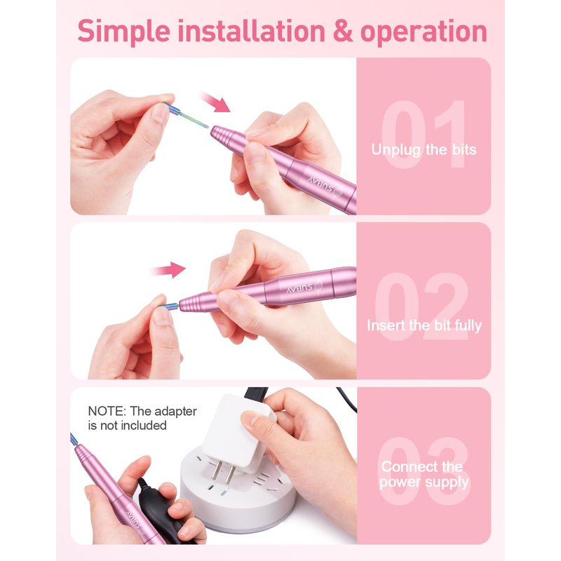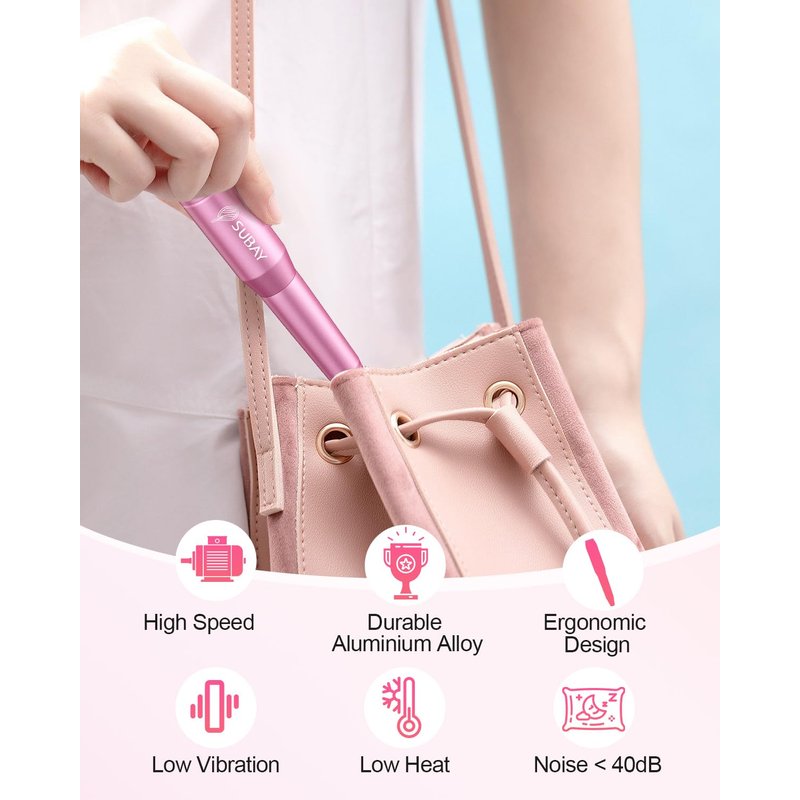 Subay Electric Nail Drill, Portable Electric Nail File for Acrylic Gel Nails, Nail Drill Kit Manicure Pedicure Tool with 6 Nail Drill Bits and 26 Sanding Bands for Home and Salon Use - Pink