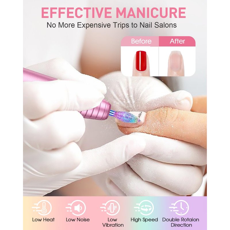 - LOW NOISE & LOW HEAT: The electric nail file is powerful but with very little noise. The aluminum handle and efficient heat dissipation system ensure a smooth and fast process of nail polishing and gel removal. Its low vibration, low heat and low noise allow you to enjoy professional nail and foot care at home