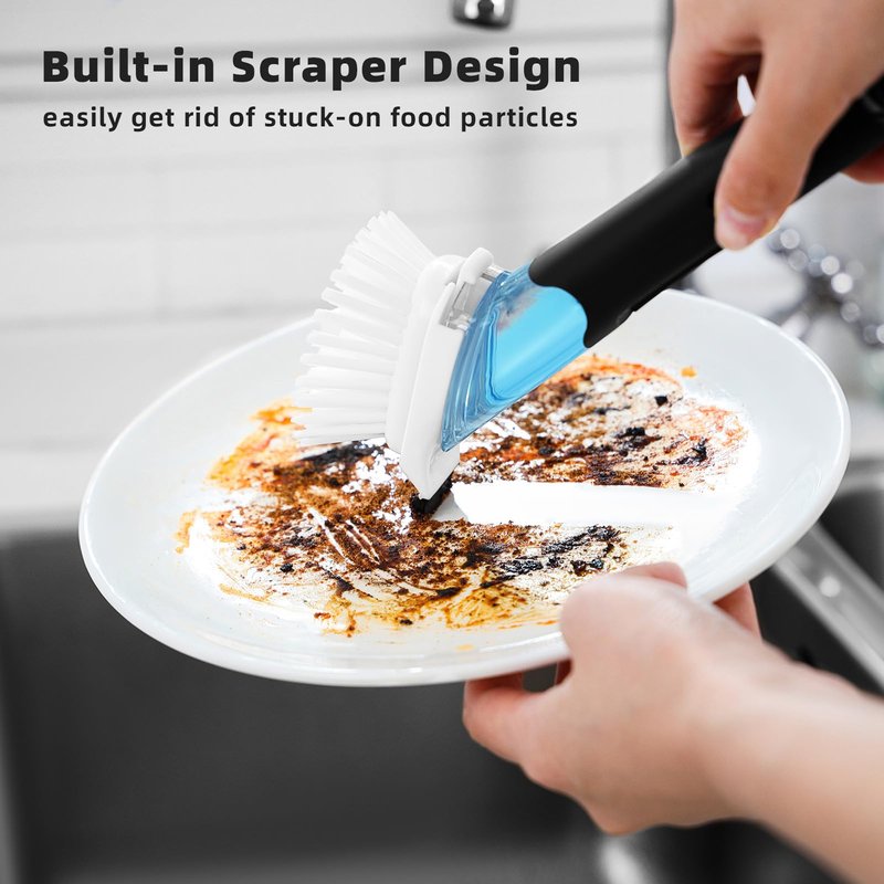 - ❹【𝐁𝐮𝐢𝐥𝐭-𝐢𝐧 𝐒𝐜𝐫𝐚𝐩𝐞𝐫】: The brush head has a scraper on the back to remove stubborn stains from dishes or sinks.