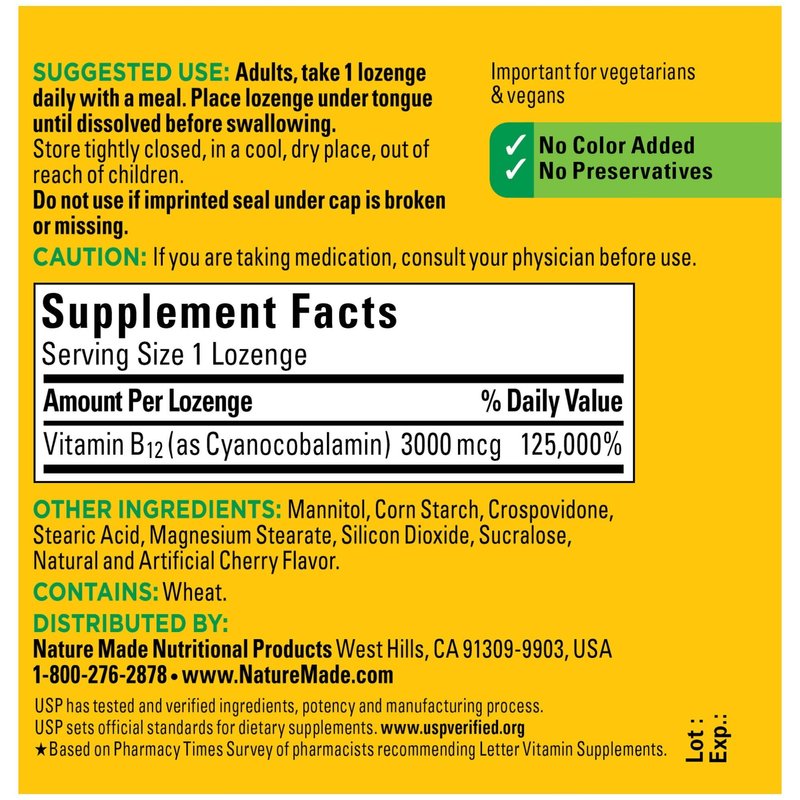 - Contains a 40-day supply of Nature Made Sublingual Vitamin B12 3000 mcg Micro-Lozenges, 40 lozenges per bottle.