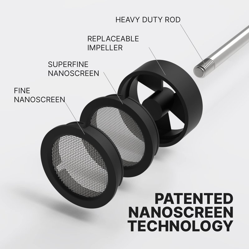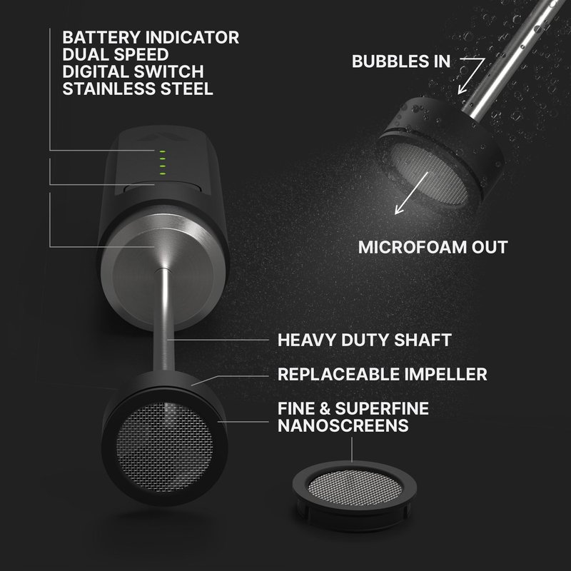 - Advanced Features: Our Black Lithium Nanofoamer provides 300% more power than conventional handheld milk frothers for unbeatable whisking capabilities. The microfoamer includes a digital on/off switch, replaceable impeller, click-on NanoScreens, stainless steel motor cover, a more stable heavy-duty stainless steel shaft, and new battery housing to reduce vibrations, IP4 waterproofing, premium internal components, and overall better design and engineering.