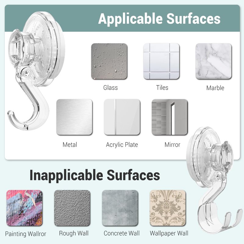 - SUITABLE SURFACES - This shower suction hook provides robust and dependable suction on smooth, non-porous surfaces such as windows, ceramic tile, glass, mirrors, granite, stainless steel, acrylic, laminate, and glossy finishes. Please be aware that it is not suitable for use on porous or uneven surfaces like painted walls, cement walls, or textured tiles.