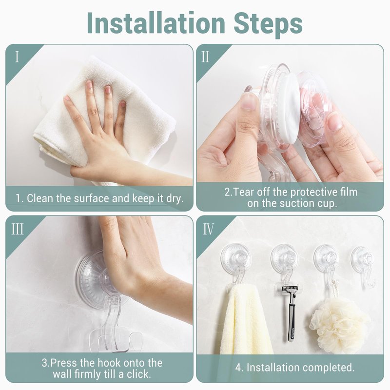 - MULTIPLE-USE SUCTION CUP HOOKS - This suction cup shower hook serves multiple purposes, functioning as a towel hanger while also providing a convenient spot for your shaver, razor, robe, loofah, and sponge. Extend its use to the kitchen for hanging spoons, washcloths, and other kitchenware, or utilize it to hang holiday wreaths and various decorations.