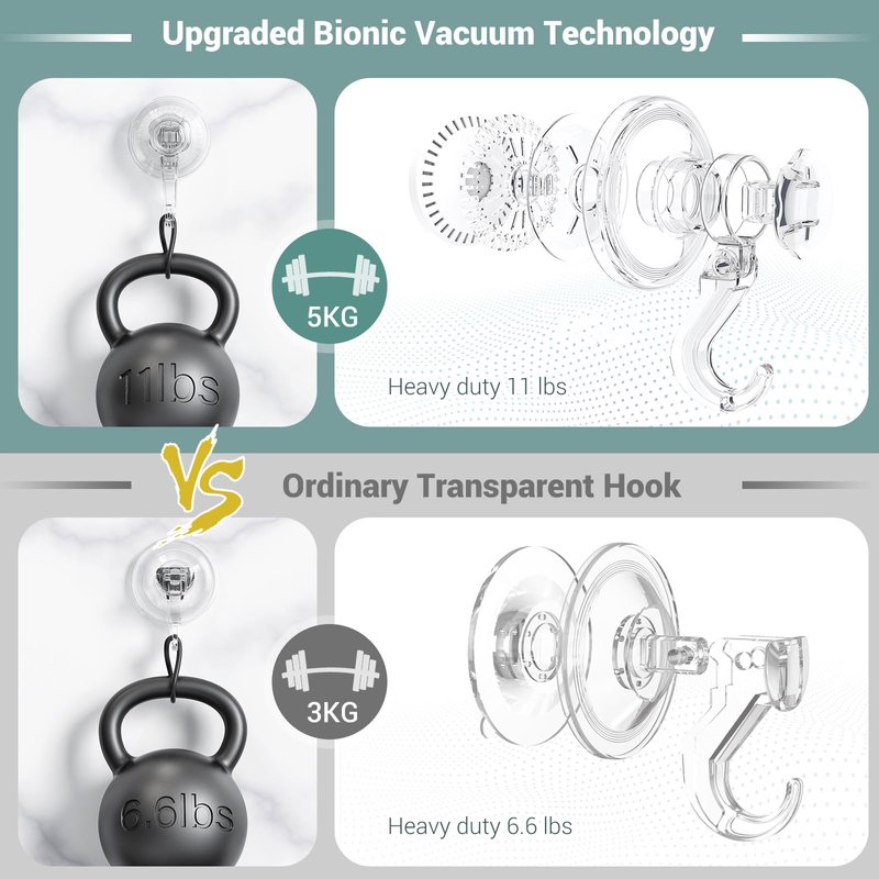 - REUSABLE VACUUM SUCTION HOOK - Our innovative vacuum adsorption design ensures maximum suction strength. This suction cup towel hook can support up to 11 lbs/5kg. Plus, the vacuum hook is reusable, offering an ideal solution for convenient and durable wall storage.