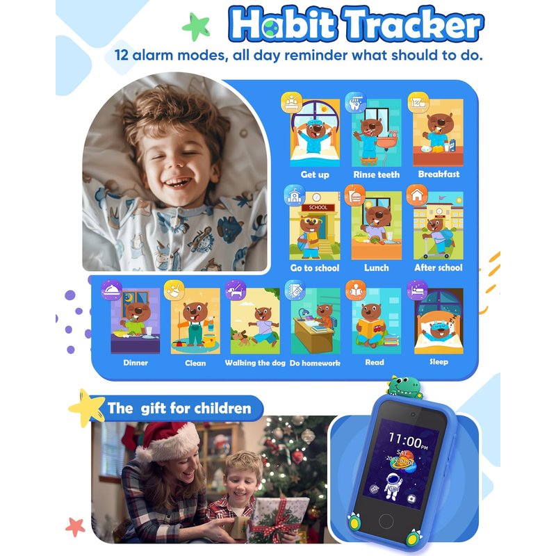 - Learning & Explorations: Kids smart phone has 14 puzzle games, it can help children exercising their logical thinking, reaction skills, and hand-eye coordination. Beyond just play, this toy phone helps children learn ABC recognize landmarks, and develop a sense of exploration. It also includes habit tracking features to help children maintain good daily routines and cultivate a sense of time.