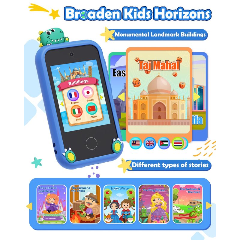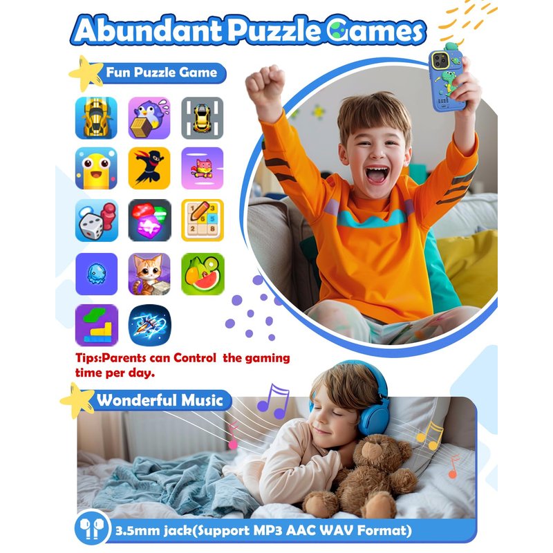 - Great Gift for Boys: Our kids phone built in 10 classic fables and music player, dive into a world of wisdom and adventure with 10 beautifully narrated fables, making learning a delightful experience. Support 3.5mm headphone jack, ensures compatibility with most standard headphones. The lightweight and compact design makes it the perfect companion for long journeys or quiet moments at home. Spend leisure time happily without exposing your children to potential online dangers.