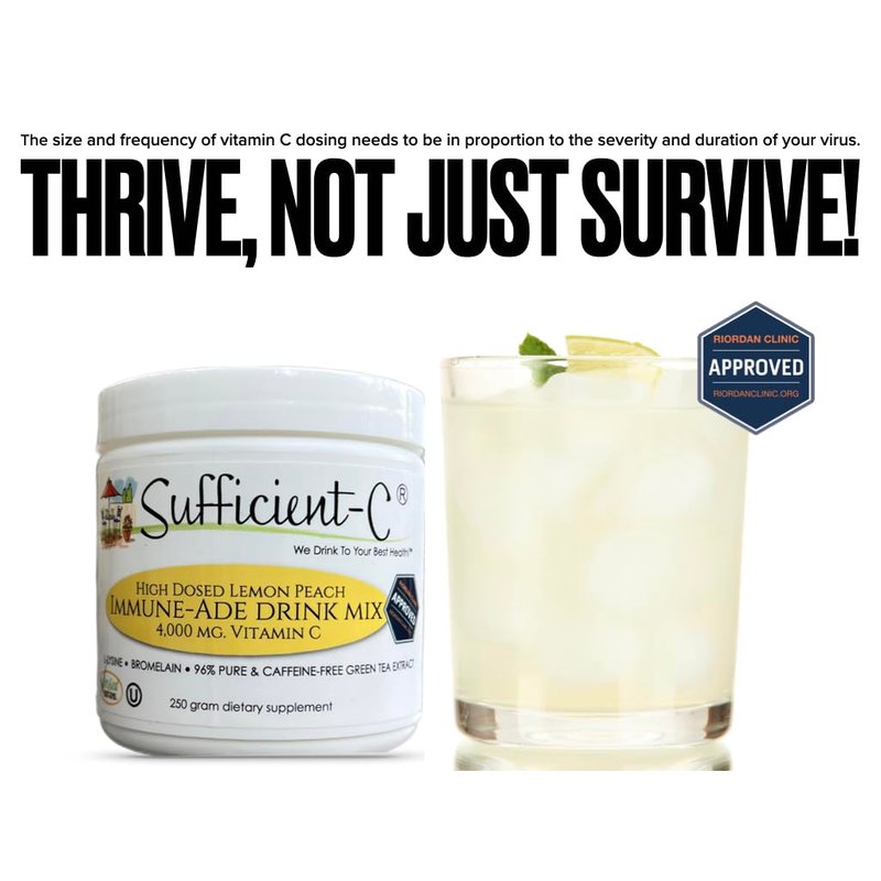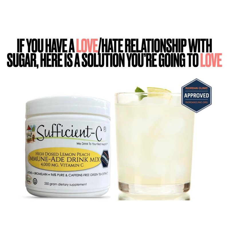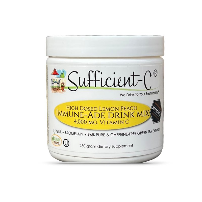 Sufficient-C High-Dosed 4000 mg. Vitamin C Lemon Peach Immune-Ade Drink Mix 250 gram size - Refreshing with Generously Dosed L-lysine, Bromelain & 96% Pure, Caffeine-Free Green Tea Extract