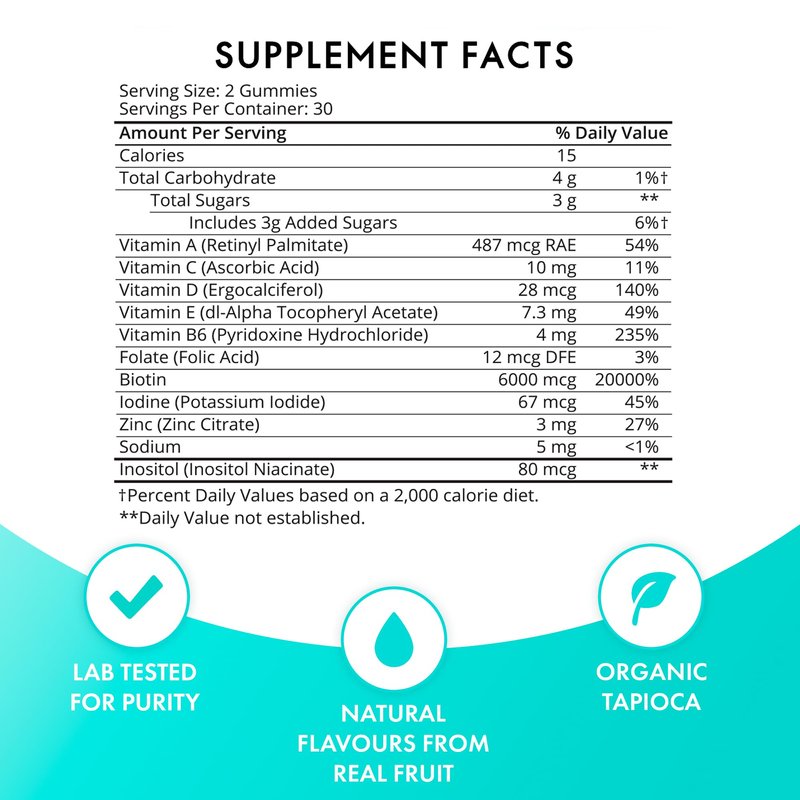 - Scientifically-formulated blend of Vitamin A, 6,000 mcg Biotin, Vitamin C, Vitamin D, Vitamin E, Vitamin B-6, Folic Acid, Vitamin B-12, Biotin, Iodine, Zinc, Choline, and Inositol. Biotin helps maintain existing hair growth and contributes to the normal strength of hair and nails.*