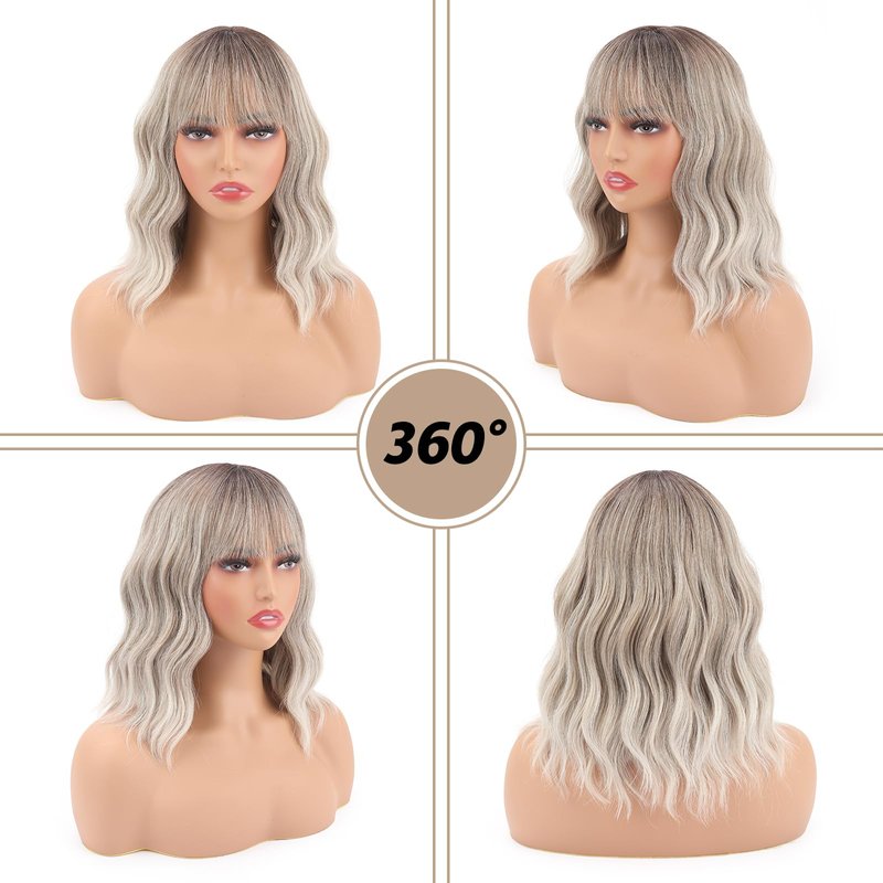SUIYISHANGMAO Short Wavy Wig with Bangs for Women,Shoulder Length Short Bob Wigs,Loose Wavy Wig,Charming Synthetic Wigs with Natural Wavy Heat Resistant Hair for Daily life and party use (Linen gray)