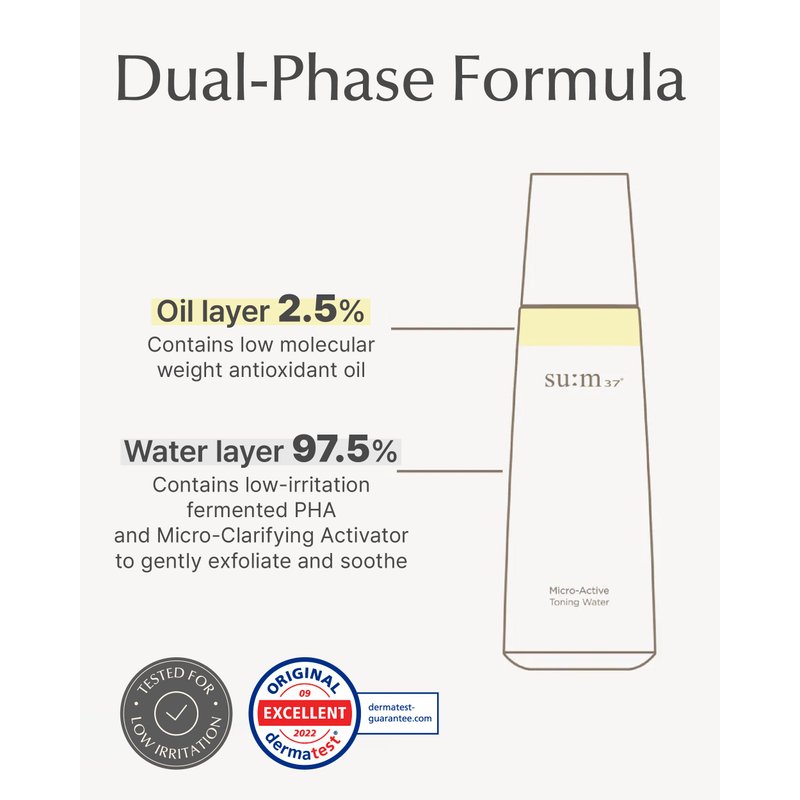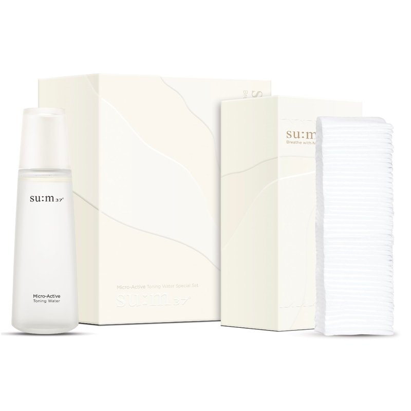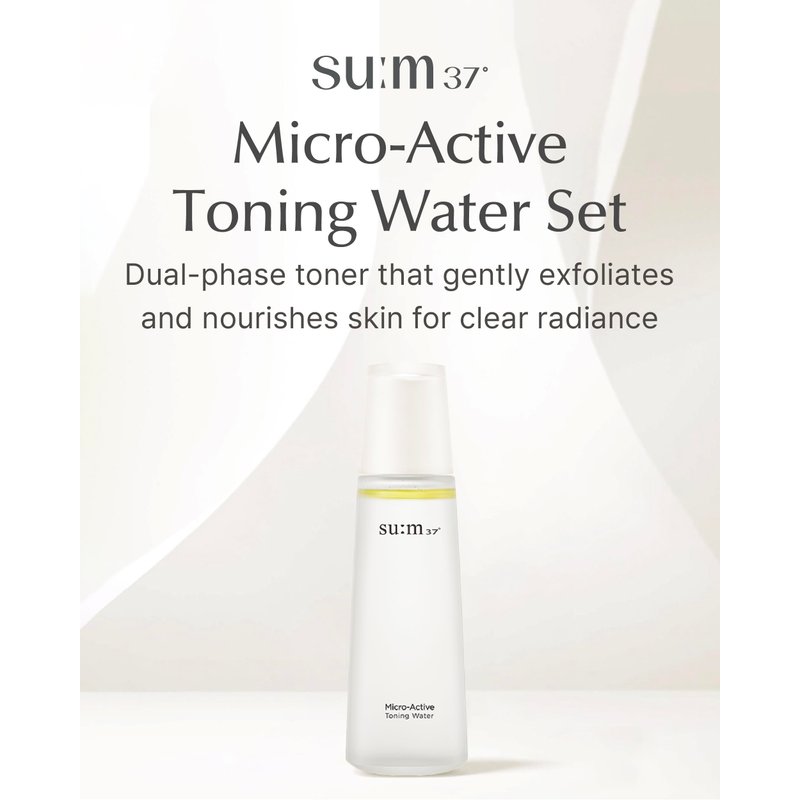 - SU:M MICRO-ACTIVE TONING WATER (5.07 fl oz) - This toner features a unique dual-phase liquid with a colorless water layer and a yellowish oil layer, providing comprehensive care by combining gentle exfoliation with deep nourishment. The innovative formula effectively removes surface impurities while enhancing your skin's natural radiance.