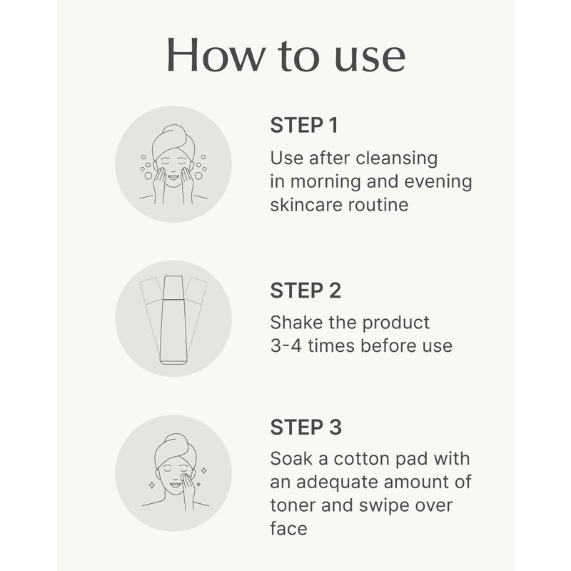 - EASY APPLICATION METHOD - Simply shake the bottle 3-4 times to blend the dual-phase liquid, then soak a cotton pad with the toner. Gently sweep the pad across your face from the center outwards, following your skin’s natural texture. Alternatively, apply a few drops directly to your face and pat gently for effective absorption. Use this toner immediately after cleansing and before applying other skincare products for optimal results.