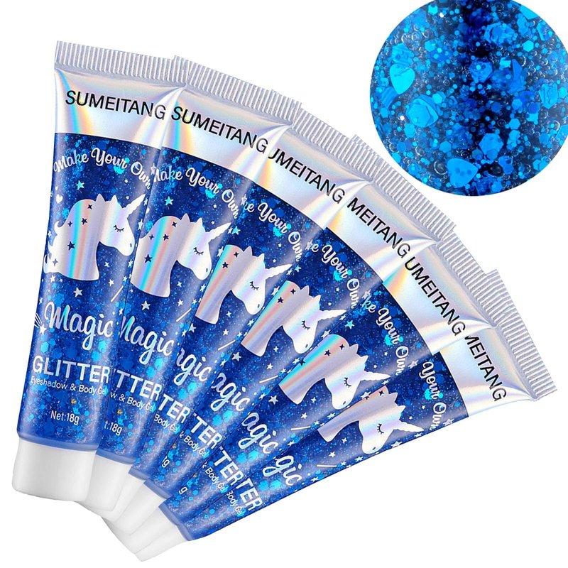 SUMEITANG 6PCS Blue Face Body Glitter Gel,Mermaid Holographic Sequins Chunky Glitter Paint for Party Singer Concerts Music Festival Rave Accessories for Girls Women Face Body Hair Sparkling Makeup