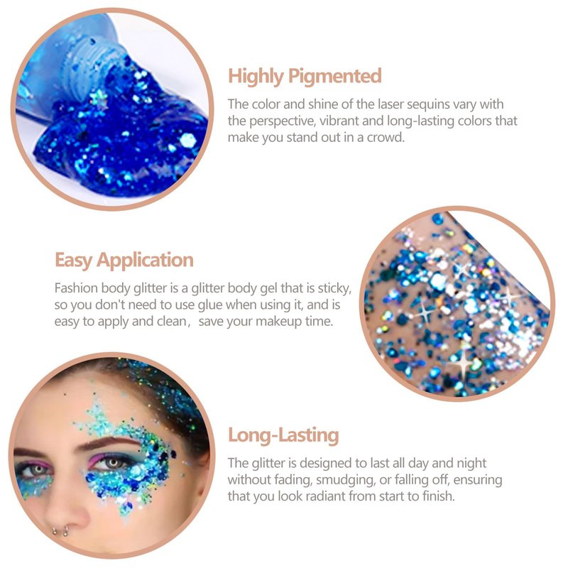 - 【Easy to Apply】Fashion Body Glitter is a glitter body gel that is sticky, so you don't need to use glue when using it, Apply the face gems glitter gel directly onto your skin, spread it with your fingertips, and let it dry for a moment. leaving sparkling and maintaining your highlight moment, making you the brightest presence in the crowd.