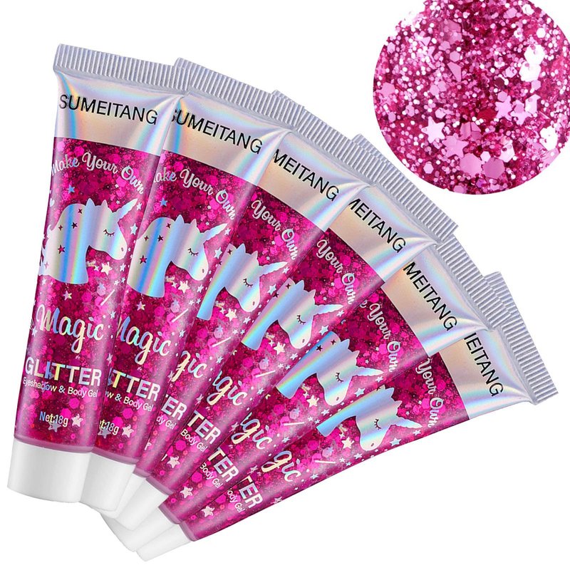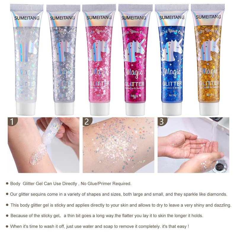 - 【6 Colors Body Glitter Gel Available】Our holographic body glitter are rich in 6 colors available:White,Silver,Gold,Pink,Blue,Red. very shiny and dazzling, and every Angle of the glitter is a different color, like a chameleon. and will show different effects under bright and dim lights. when the lights are bright, skin glitter are beautiful and shiny.when the lights are low, skin glitter also has a shimmering effect, which will make your skin sparkle in the dark and add to your charm.
