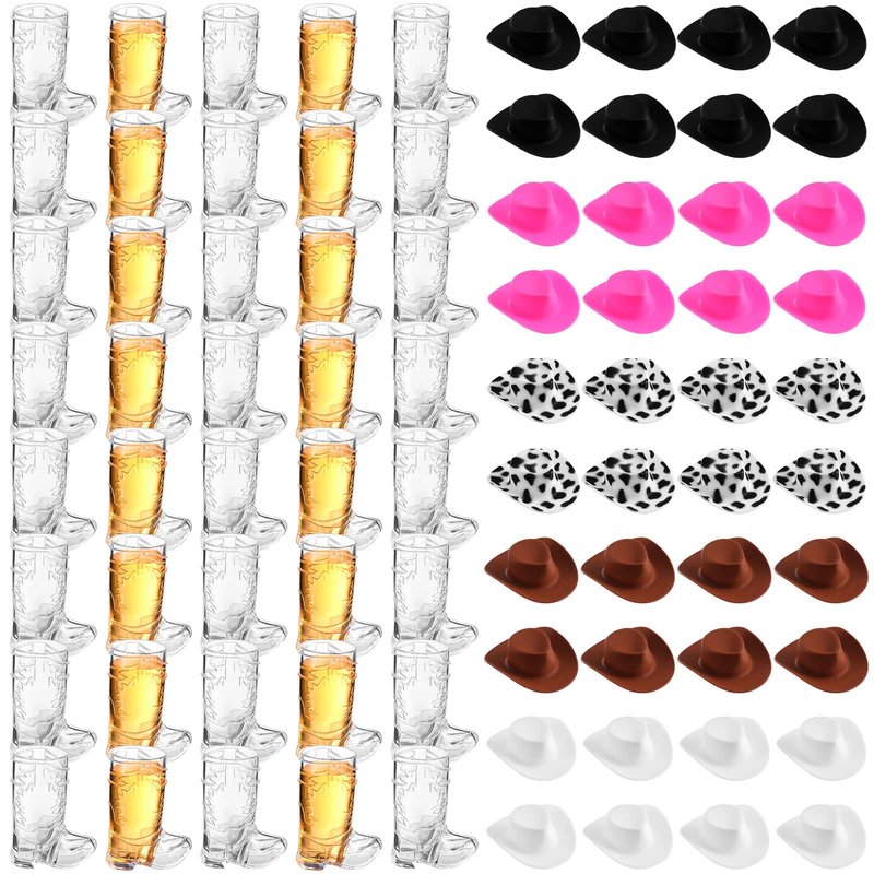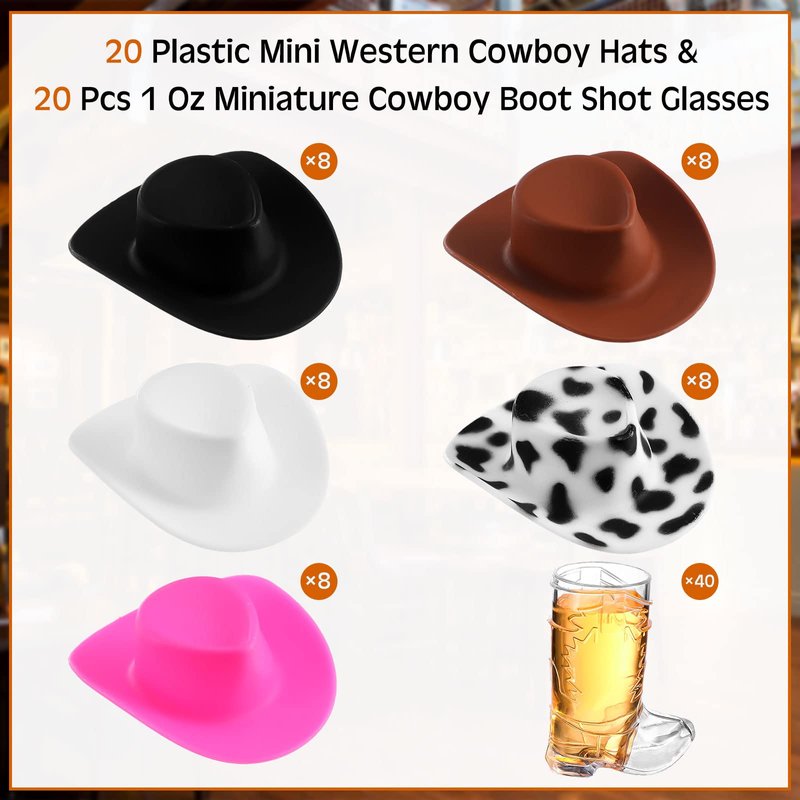 Sumind Cowboy Cowgirl Party Decorations Supplies Plastic Mini Western Cowboy Hats with 1 oz Miniature Cowboy Boot Shot Glasses (40 Pcs)