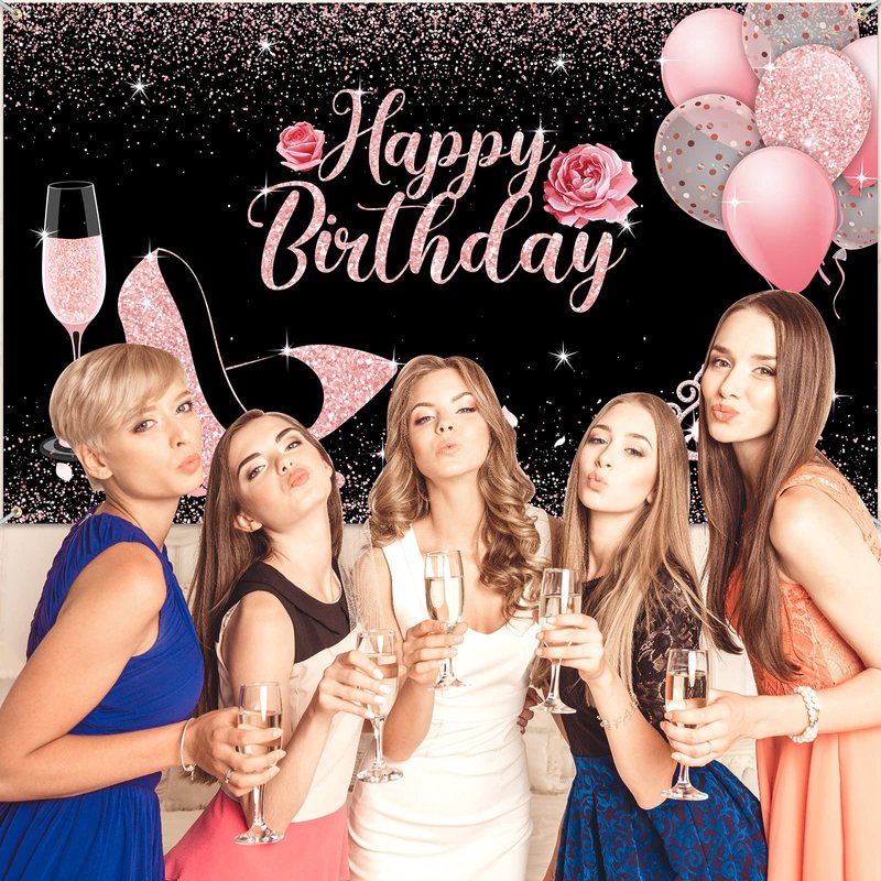 Sumind Happy Birthday Backdrop Fabric Glitter Rose Pink Birthday Background Banner Balloons Heels Wine Glass Photography Backdrop Birthday Party Decorations for Women Birthday Supplies, 6 x 3.6 Feet