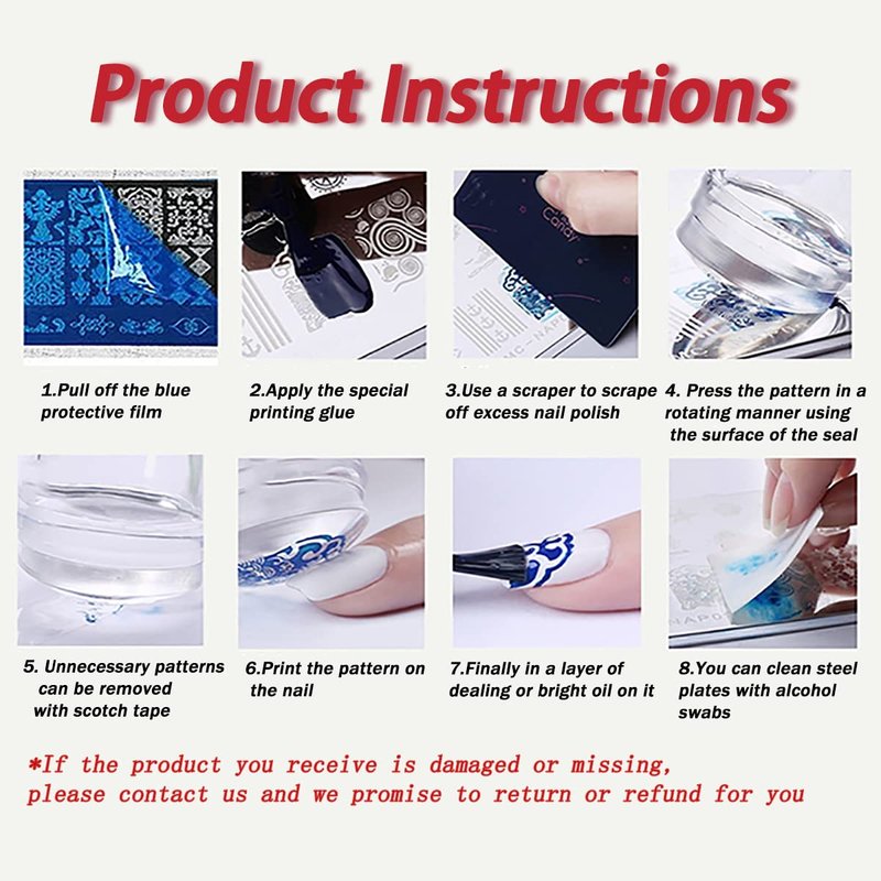 - Need Notice: Due to different nail polish quality, some nail polish is not suitable for stamping, plz choose the right nail polish, if the first time you can not transfer the design to the stamper, try again or contact us, Thanks.