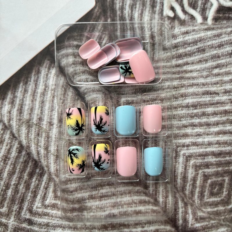 Summer Press on Nails Short Square Shaped Fake Nails Pink False Nails with Coconut Tree Designs Hawaii Glue on Nails Blue Summer Stick on Nails Full Cover Acrylic Nails Glossy Artificial Nails