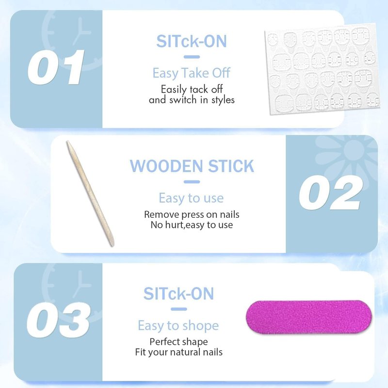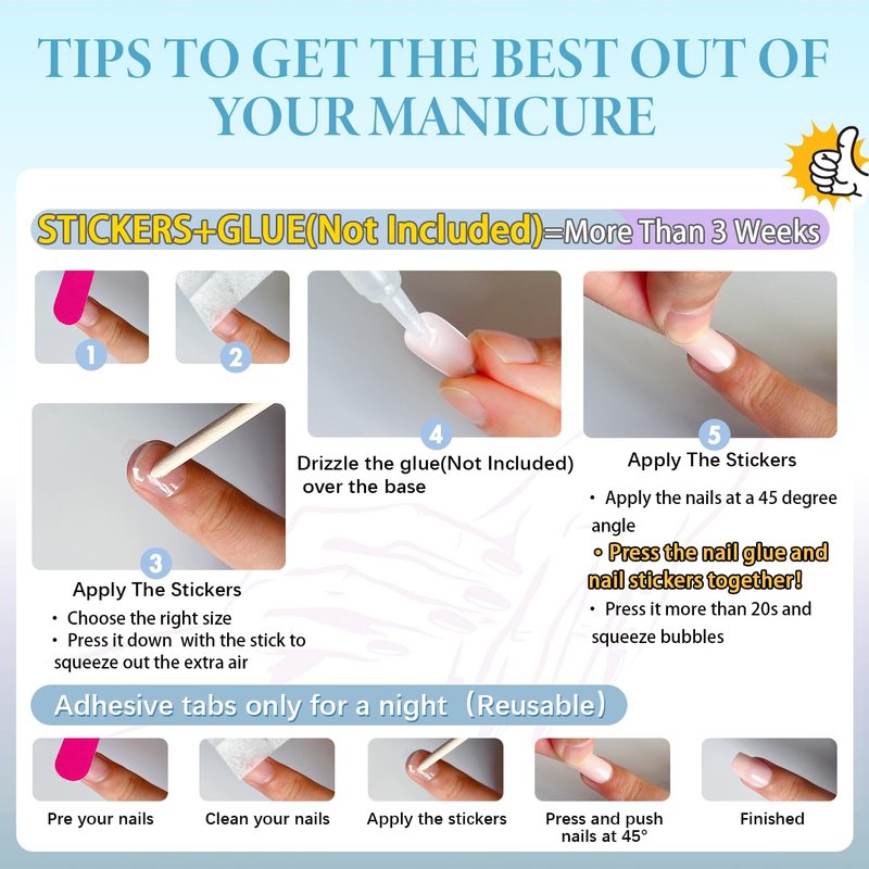 4.Please note that the nail glue is not included.If you want it last for a longer time,please use nail glue instead of the nail stickers.