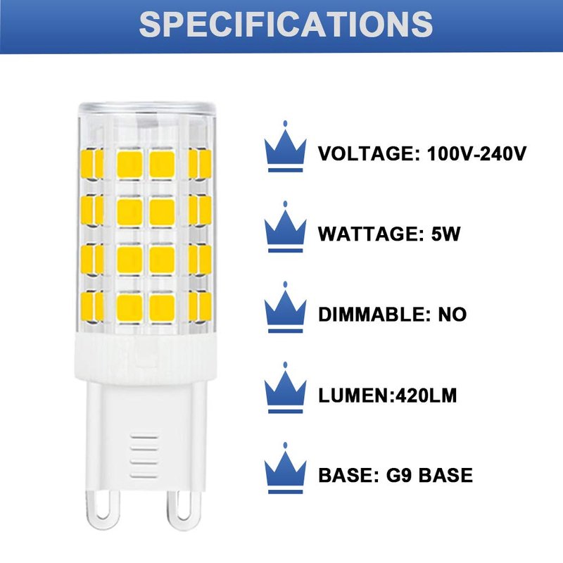 - Replace G9 40W Halogen Bulb With 5W G9 LED Bulb, Save up to 85% on Your Electricity Bill. This G9 Bulb Can Work With a Voltage Ranging from 100 Volts to 240 Volts. Stable and Durable.