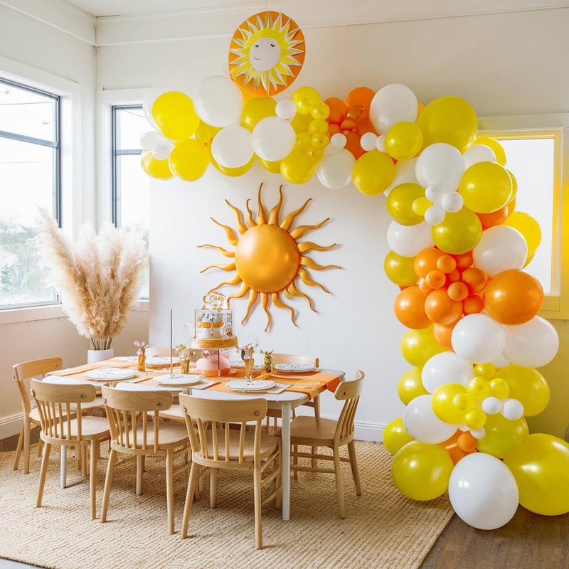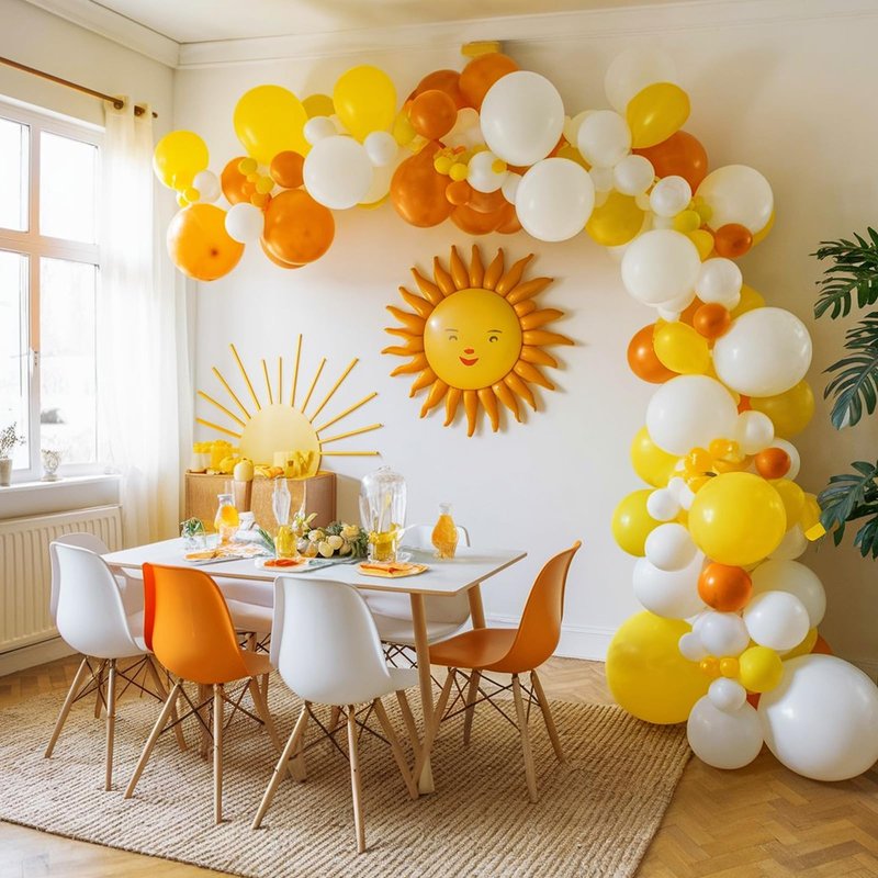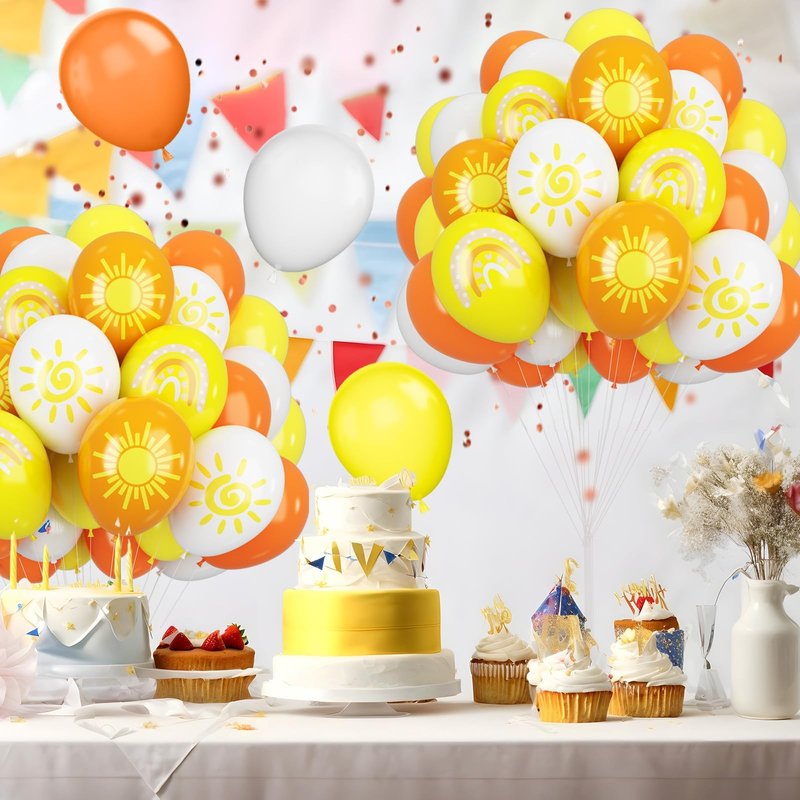 - 12 inch sun balloons set: Package contents include yellow balloons, orange balloons, white balloons, rainbow balloons, sun balloons, sunshine balloons, a balloon ribbon. The color combination satisfies all your party imagination and starts a wonderful party carnival.
