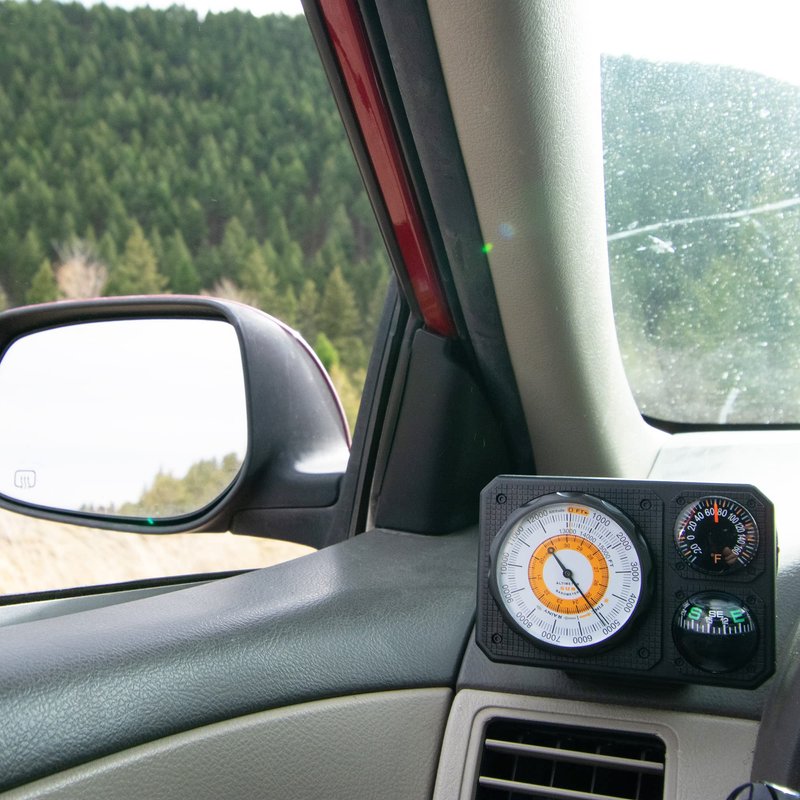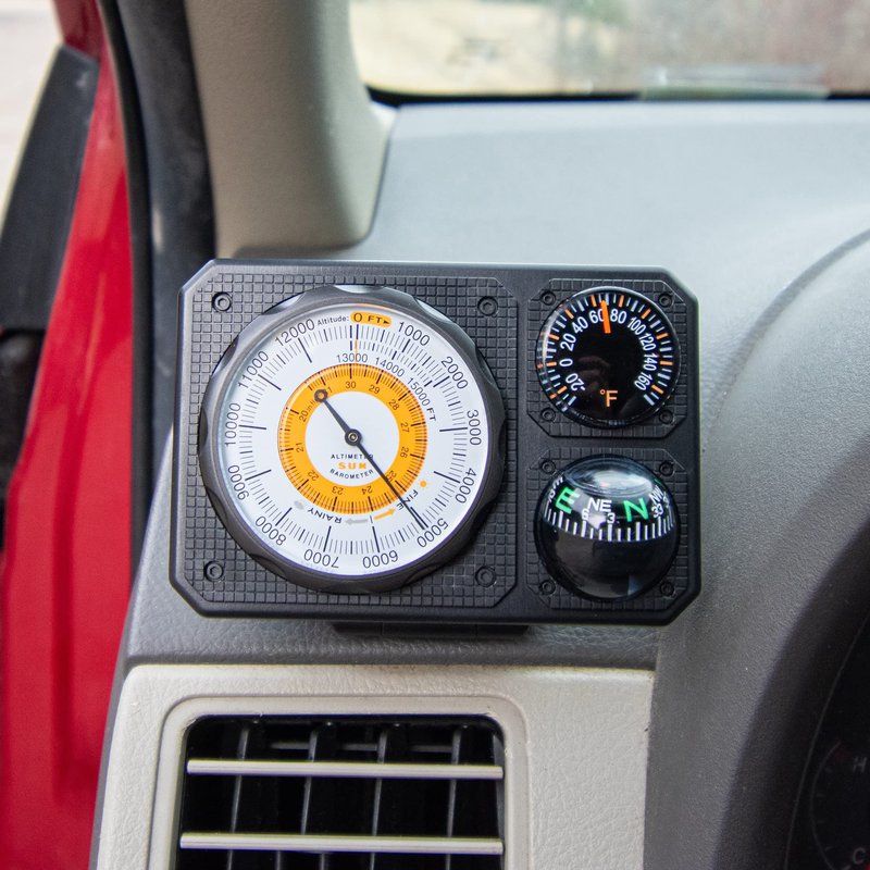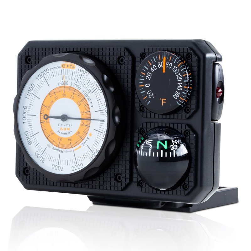 - Six Functions - Includes Altimeter (Range: 0 - 15,000 feet), Barometer, Ball Compass, Dial Thermometer, LED Light, Signal Mirror. Great addition to your car or truck and is an essential travel accessory.