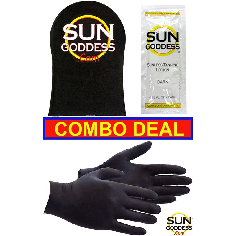 Sun Goddess - Best Combo Deal - Includes: 1 Sunless Self Tan Applicator Mitt + Sunless Self Tanner Lotion Sample + 1 PAIR Sunless Self Tanning Application Gloves - Self Tanning Mitt Lotion Gloves