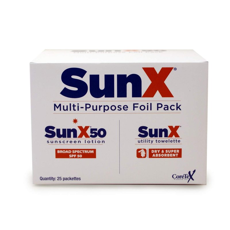 Sun X SPF 50+ Broad Spectrum Sunscreen Lotion Foil Pack Single Dose w/Attached Dry Towelette, 25 pcs