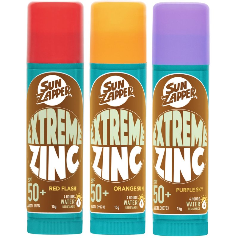 Sun Zapper Extreme Zinc Stick Triple Pack - Red, Orange, Purple SPF 50+ Water Resistant Sunscreen -15g Each