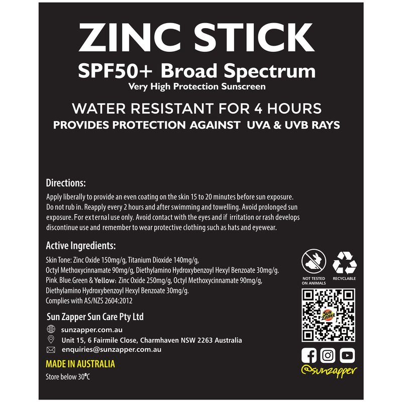 For over 25 years Sun Zapper Zinc Sticks and Products have provided hundreds of thousands of people across 40 different countries with the highest degree of broad spectrum UVA+UVB SPF 50+ and 4 hours water resistant protection.