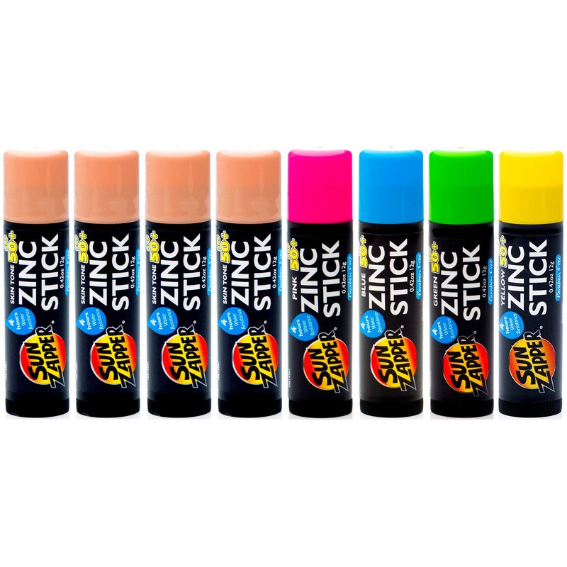 - Save Money with this Value 8-Pack includes 4x Light Skin Tone, 1x Pink, 1x Blue, 1x Green and 1x Yellow Zinc Sticks. Suitable for All Skin Types. Zinc Stick will rub Bright Colour on your skin. Stand Out & Look Good all While being Protected.