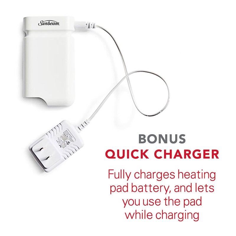 - CORDLESS HEAT WHEN AND WHERE YOU NEED IT: Cordless GoHeat Sunbeam heating pad delivers pain relief anywhere and anytime you need it—the rechargable battery and easy-to-use battery unit fit into the pad pocket