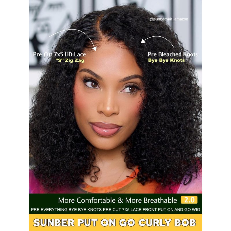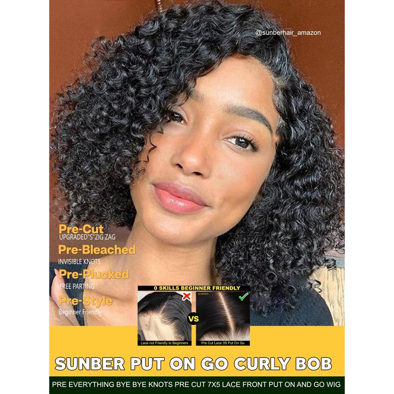 - Curly BOB Human Hair Glueless Wigs ❤ Pre Everything Glueless Short BOB Curly Human Hair Wig, Pre-Cut Upgrade Lace 7x5, Put on and Go,Easy and 0 Skill Installed, Glueless Upgrade Pre Plucked Pre Bleached knots Wig.