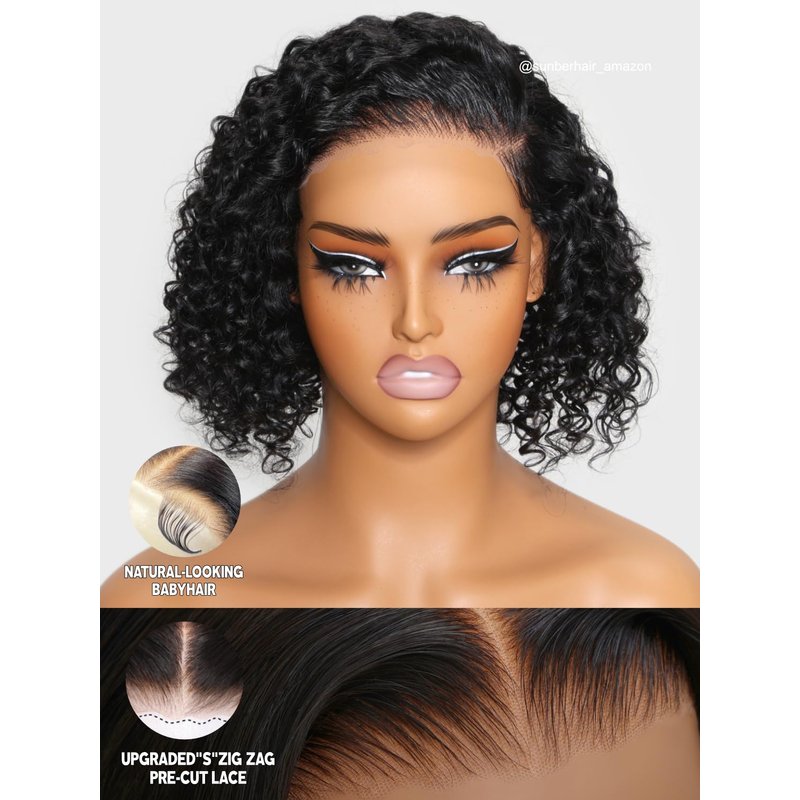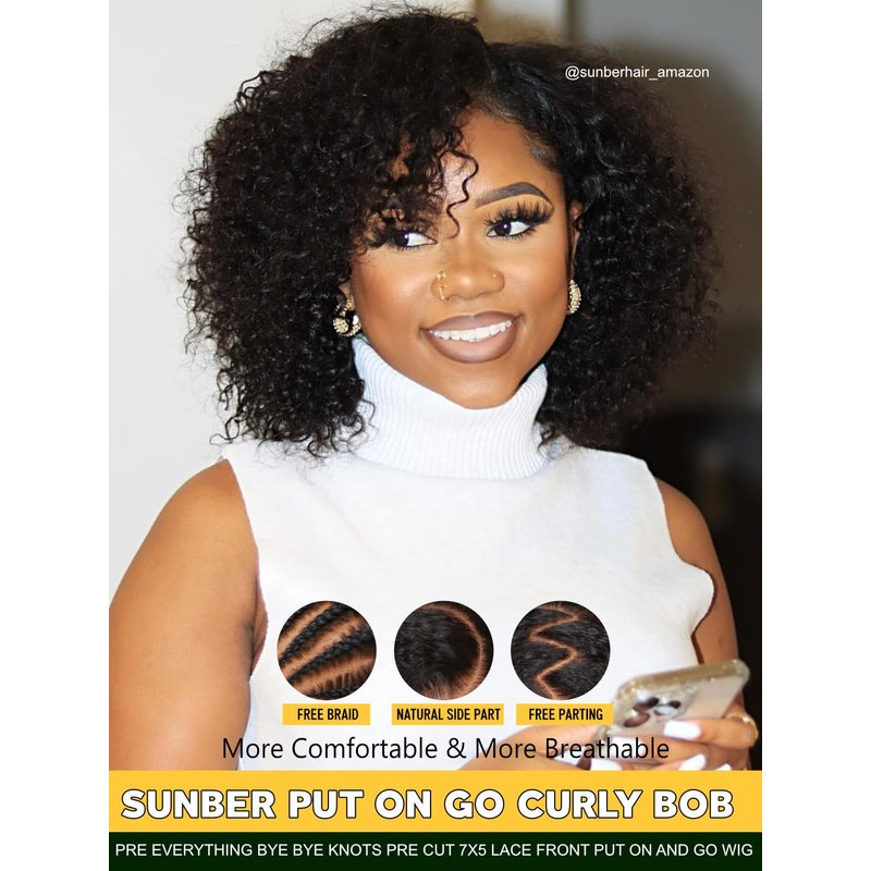 - 3S Ready to Go Glueless Short Curly BOB Human Hair Wigs ❤ Bye Bye Knots Short Curly BOB 7x5 Lace Front Wig for Women Pre Plucked Can Be Dyed ,Permed, Bleached, Highlighted, Straighten,No Glue,No Gel,Easy to Install, No Skills Needed, Beginner-Friendly.