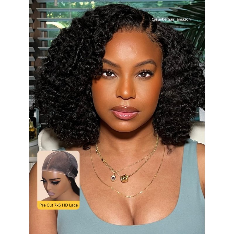 Sunber Bye Bye Knots Curly Human Hair Glueless Short Bob Curly Wigs Human Hair Pre Plucked Curly BOB Wig Pre Cut Lace 7x5 HD Lace Closure Wigs Pre Bleached Invisible Knots Put on Go Bob Wig