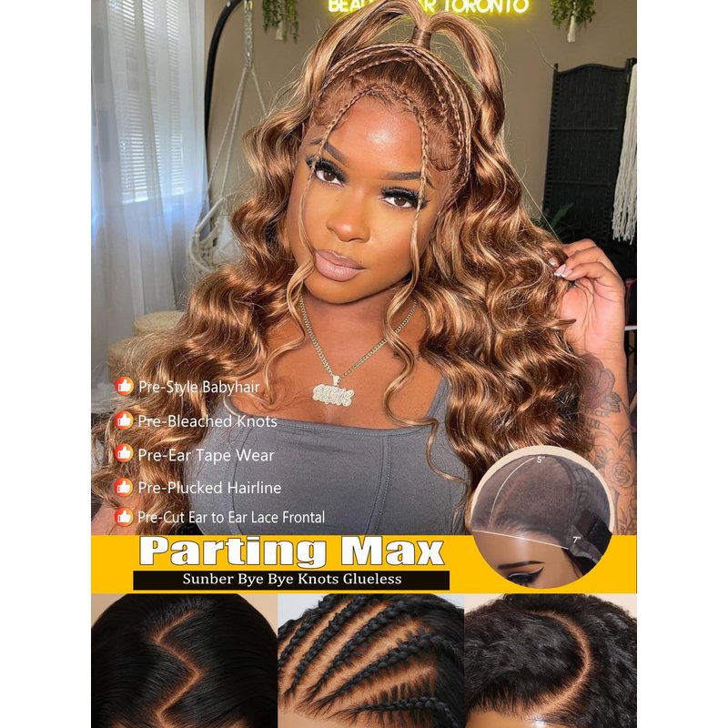 Sunber Bye Bye Knots Glueless Wig Body Wave 7x5 Lace Front Wigs Invisible Knots Lace Front Wigs Human Hair Honey Blonde Highlight Pre Everything Wig Pre Plucked Pre Cut Highlight Piano Blonde 20Inch
