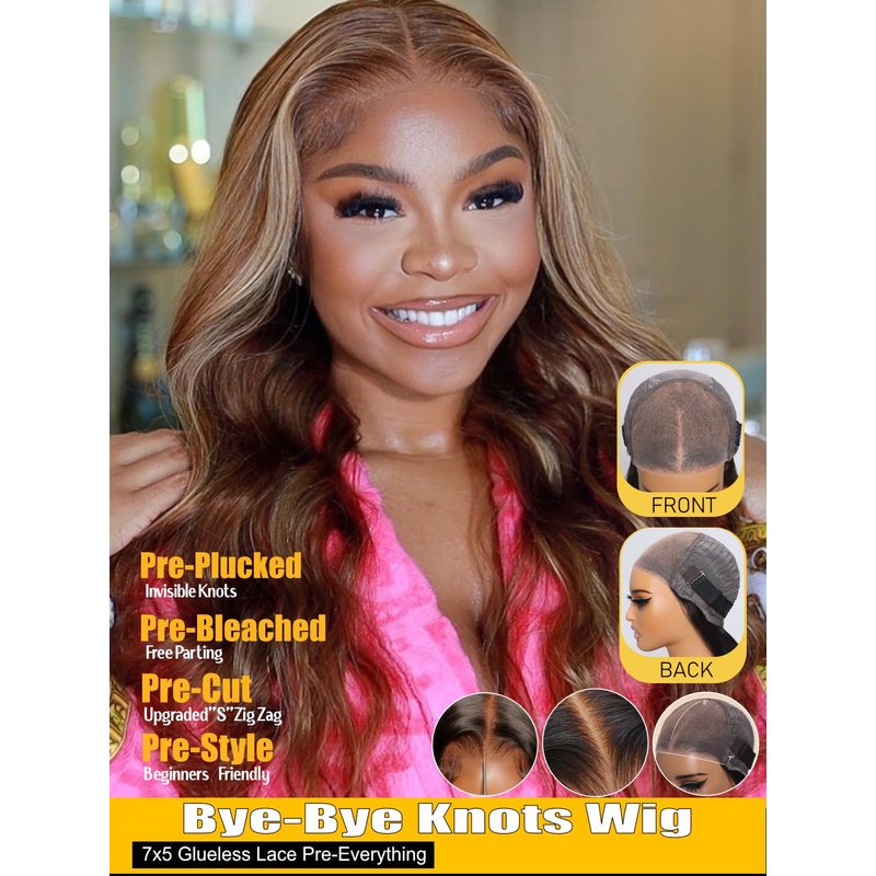 - ---Ombre Highlight Blonde Color Pre Bleached Wig---The Ombre Honey Blonde 7x5 Lace Front Wig Human Hair Bye Bye Knots Wigs is New Wig Type. All Knots is Pre-bleached, Very Natural Looking. Most Easy Wear for Beginners. Fast to Change Hairstyle Anytime.Enjoy luxurious curls and effortless style with this top of the line closure wig.