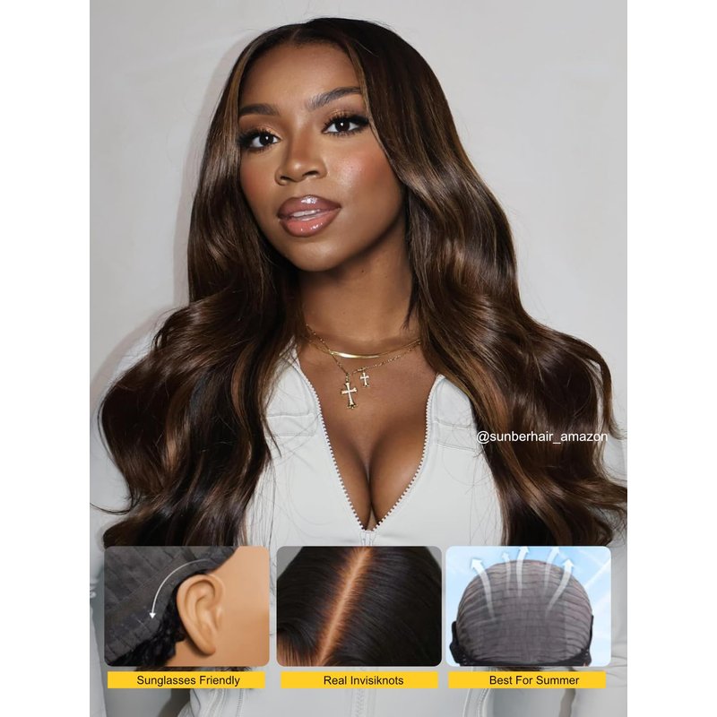 Sunber Ombre Highlight #FB30 7x5 Lace Front Glueless Human Hair Wig Balayage Wavy Pre Everything Put On Go Pre Bleached Invisible Knots 16Inch Piano Chocolate Brown 180% Density Body Wave Frontal Wigs