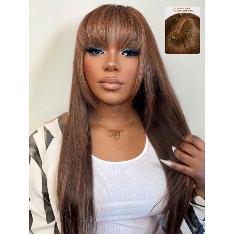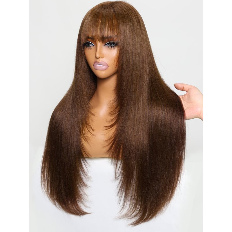 - Color: Straight | Chocotlate Brown with Bangs | 4x2 HD Lace Yaki Straight