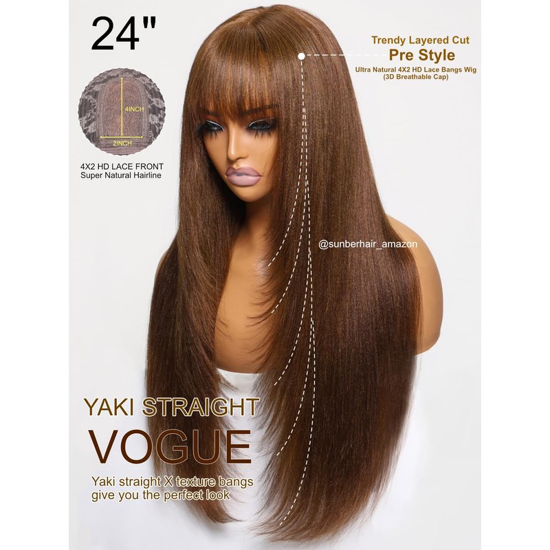 Sunber Yaki Straight 4x2 Lace Closure Chocotlate Brown Yaki Straight with Bangs None Lace Front Wigs 12A Brazilian virgin Hair Wigs with Curtain Bangs Glueless Full Machine Made 180% Density